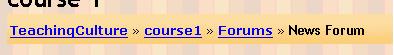 You can always see where you are in the Moodle site by looking at the top of the page where you will see the path you have taken underneath the course name. This is called a crumb trail (after Hansel and Gretel). For example Teaching Culture, Course1, Forums, news forum.